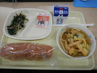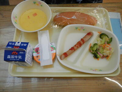 今日の給食は1年生の写真です。主なメニューはむえんせきロングウィンナー,野菜サラダ,コーンとカボチャのポタージュ アセロラゼリー,コッペパンです。「無塩せき」とは塩が使われていないということではなく,発色剤を使用していないという意味だそうです。パンには切り込みがなかったのでホットドックにして食べてる子はいませんでした。