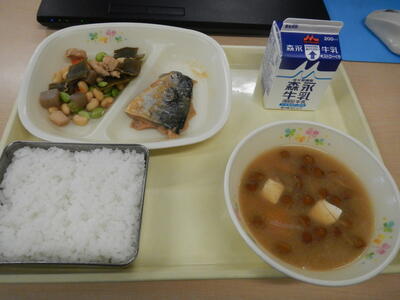 今日の給食は子供たちにも人気があるサバの味噌煮,大豆の五目煮,なめこの味噌汁の和風献立です。
