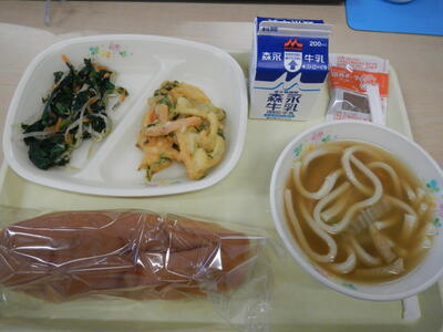 今日の給食のメニューは米粉パン 野菜かき揚げ 和風うどん えのきとほうれん草のおひたし です。かき揚げをうどんにのせれば天ぷらうどんの完成です。そしてなんと今日はコーヒーミルメイクが付いてます。今日は粉のタイプなので子供たちは牛乳パックを開けて粉を入れ,再び閉じてシェイクシェイクします。上手にコーヒー牛乳ができたかお家に帰ったら聞いてみてください。