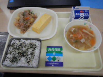 今日の給食はすいとん汁,肉じゃが,厚焼き玉子,海苔ふりかけです。すいとん汁は小麦粉に水を加えて作った団子をお汁に入れたものです。今日は平たく伸ばされた団子になっていました。