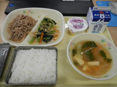 お久しぶりです。今日の給食です。山元町小中学校では今年に一度の給食週間が16日より始まりました。今日は山元中生のリクエスト献立です。ビビンバ,ナムル,中華スープのアジアメニューでした。